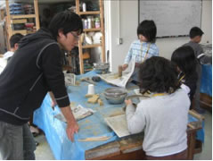 乾燥した粘土を砕きふるいにかけて、水を加えてねり、粘土をつくるところから体験してもらいました。自分 で作った粘土を使い、自分だけのオリジナルの器作りをしてもらいました。これを乾燥させておき、次回はこれに絵を書いていきます。