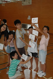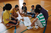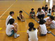 参加者を7つの班に分けて,「運んで・つないで・なにできた?」「絵伝言」「並びかえゲーム」「進化リレー」の4つのゲームを行いました。初めて会う子どもたちが協力してゲームをするためにはコミュニケーションが必要です。言葉,体,眼etc あらゆる手段を使って意思伝達を図り,仲間を盛り上げながら活動していました。最後は表彰式を行い,参加者全員にはバッジを上位チームには賞状が手渡されました。