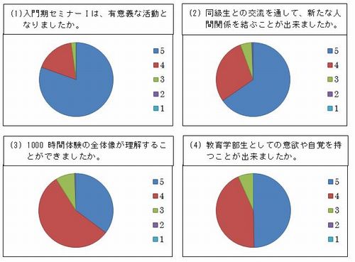 大学1年生は,家族と離れ1人で知らない地域に住み,まだ友だちも少ない中での生活が始まること,高校と違い学級や担任の先生がいない中で,自分で必要な授業を履修し臨むこと,1000時間体験学修を実施すること…。様々な不安を抱えている中で,スタートします。 そのような状況を理解し,支えてくれる先生や先輩がいて,いつでも相談できること,そして一緒に入学した多くの同級生が仲間としていることを,一泊の生活をともにすることで実感でき,これから始まる大学生活への希望と意欲がさらに高まっていることが分かります。入門期セミナーⅠは,高校生活から大学生活への移行において感じるギャップを解決できる初年次教育のガイダンスとして,とても有効に機能していると言えるでしょう。 また,学生スタッフの2~3年生にとっては,研修内容の企画や実際の運営を任されることで,これまで培ってきた企画力や実行力を発揮できる場となっています。昨年度の1月中旬から組織作りを始め,統括リーダー6人を中心とした36人でこのようなセミナーを開催できたことに,これまでの1000時間体験学修の成果の大きさを感じることができます。そして,今後のそれぞれのさらなる活躍が楽しみにも感じられます。 これから始まる平成25年度が,こうした教育学部生の活躍によって,さらに充実したものになることを確信しています。