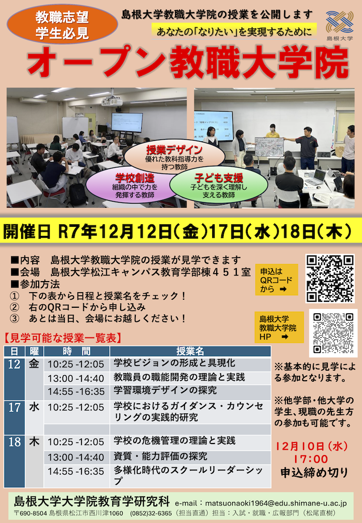 R7オープン教職大学院を12月12日(金),17日(水),18日(木)に開催します。詳しくは,チラシをご覧ください。ご参加お待ちしています。
